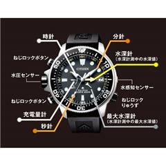 [シチズン エコ・ドライブ時計 BN2036-14E]の商品説明●最大70mまで計測可能な針式の水深計機能を搭載。