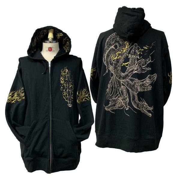 【即配 ブラック XLサイズ】【エントリー最大P31倍】和柄 ZIP パーカー ジャケット「ヤマタノオロチ」裏パイル 龍 竜 仏画 迦楼羅焔 天叢雲剣 草薙剣 草那藝之大刀 メンズ 京友禅