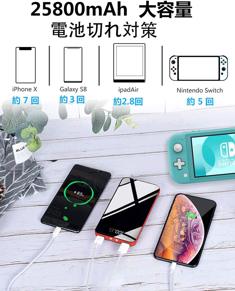 小型の上に25800mAhの超大容量により、一度フル充電すれば、一週間再充電の必要がありません.iPhone 6Sに約10回、Xperia XZ2に約6回、Galaxy S9 約6回の充電が可能です。